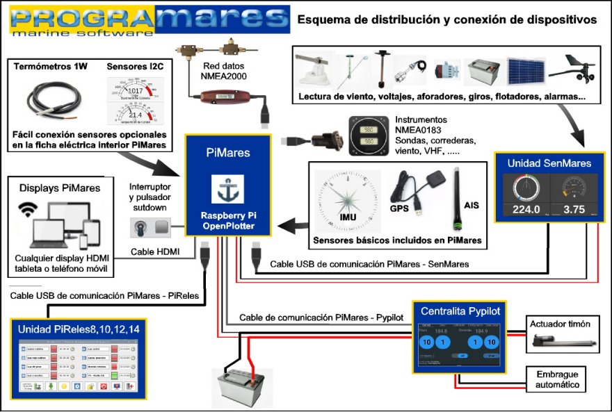 El software Openplotter incluido en PiMares permite en apenas un par de minutos la posibilidad de leer cualquier instrumento de su yate que envíe datos en formato NMEA0183 y si su yate tiene una red NMEA2000 en servicio podrá aņadir todos los datos de la red a PiMares con solo conectar un convertidor NMEA2000. Si a bordo dispone de un piloto automático que puede recibir sentencias NMEA0183 y desea enviarle desde PiMares las rutas que traza en la cartografía solo necesita el convertidor NMEA0183 para ese propósito. Si por el contrario prefiere una integración total de su actual piloto automático en Openplotter necesitará alguna de las avanzadas centralitas Pypilot. |