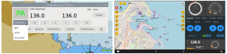 Las centralitas Pypilot se conectan directamente al actuador de su timón y a su unidad PiMares o a su Raspberry Pi con Openplotter y le ofrecen un completo control, desde la mesa de cartas o desde sus tabletas, de las funciones de gobierno automático de su yate. Pypilot dispone de los modos compas (IMU), GPS, viento aparente y viento verdadero para que usted elija que instrumento gestionará el rumbo de su piloto automático. Todas las aplicaciones de Openplotter se integran inmediatamente con las centralitas Pypilot. La cartografía OpenCPN dispone de su propia ventana (plugin) de control exclusivo para centralitas Pypilot y el tablero de relojes web KIP le permitirá incrustar la ventana de control Pypilot en cualquiera de sus pantallas. |
