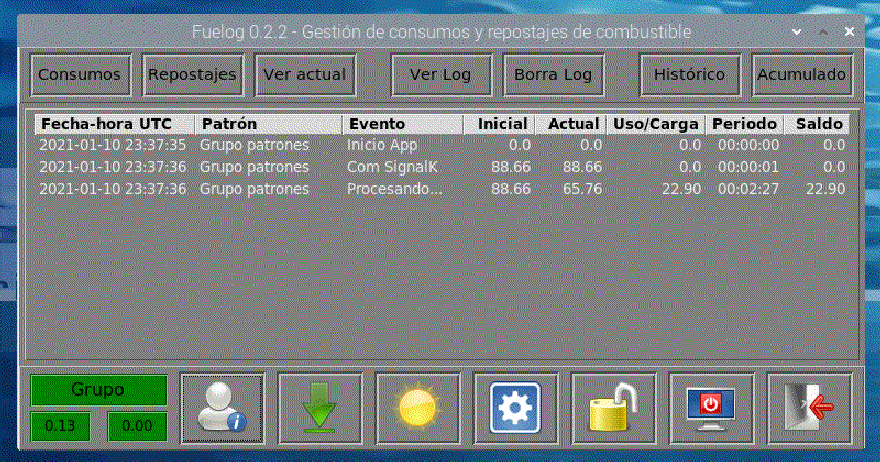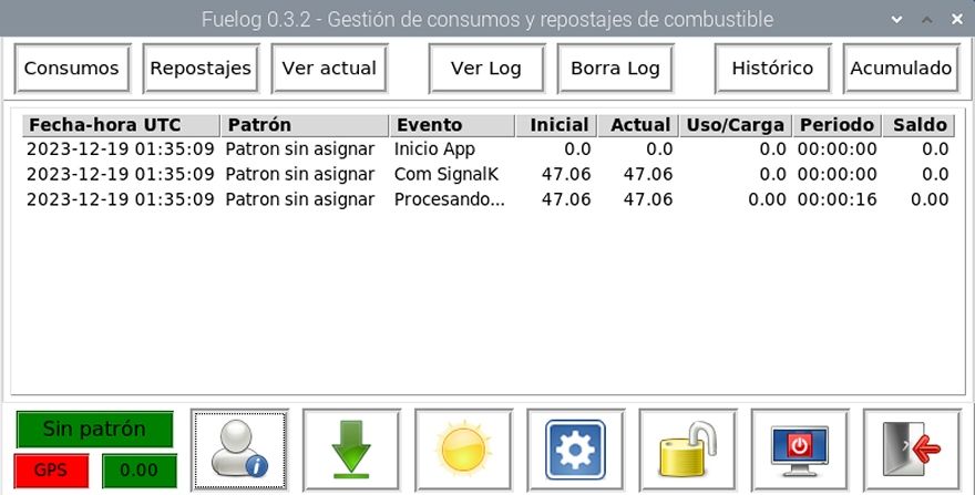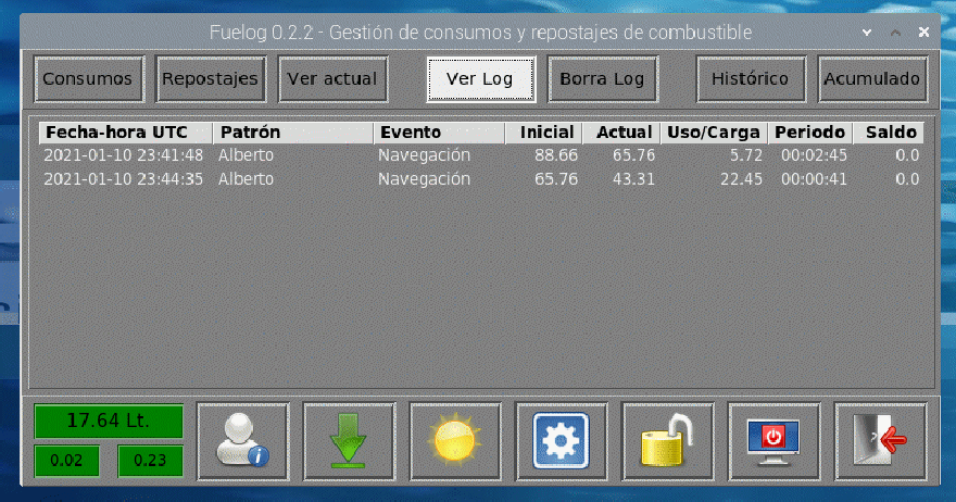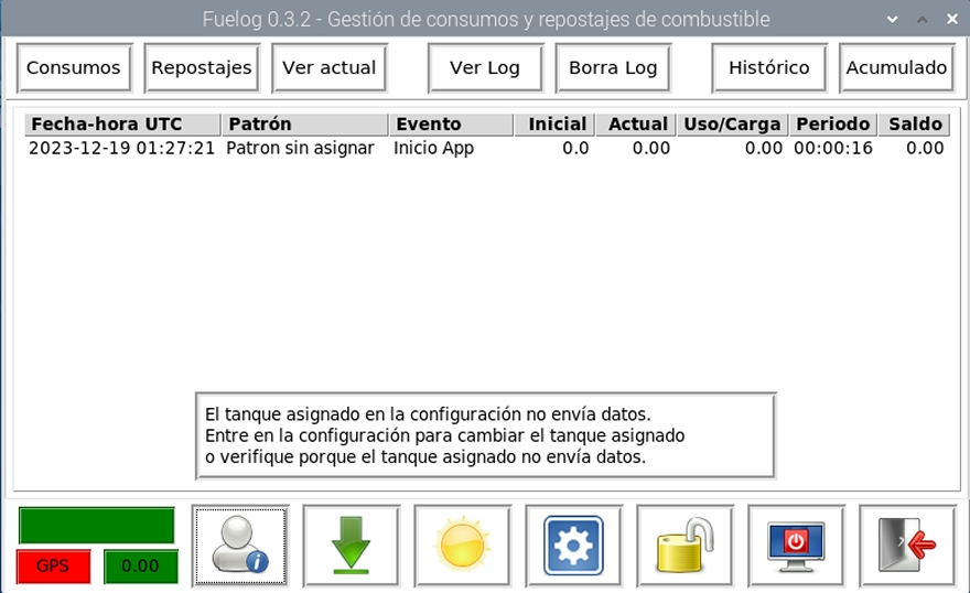 En su menú inferior encontrará los botones que permiten el control de la aplicación Fuelog.