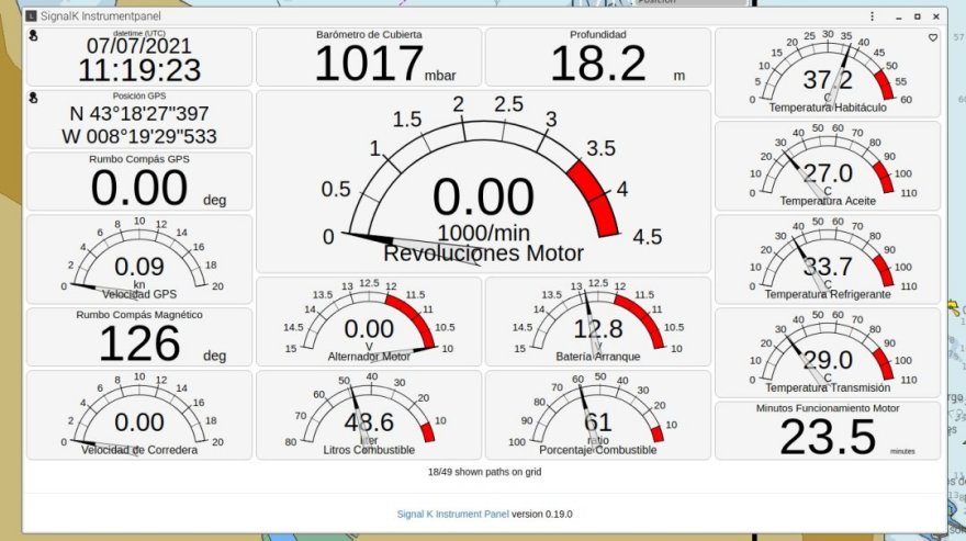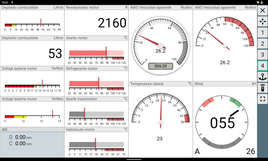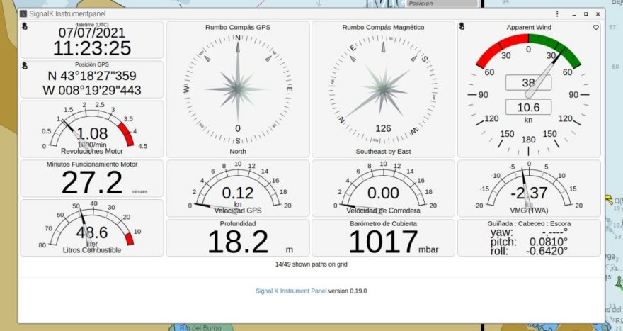 Openplotter dispone de 6 diferentes Apps de tablero de instrumentos con el mismo propósito de crear displays al gusto del usuario con sofisticados y coloridos relojes para su mesa de cartas o sus dispositivos móviles. Por otra parte, como ya hemos comentado, las dos aplicaciones de cartografía incluidas en Openplotter, Opencpn y Avnav, disponen de sus propios tableros de relojes configurables que se hacen visibles sobre la carta. Sin duda esta desmesurada cantidad de medios para la creación y configuración de displays y la velocidad de refresco de los datos que en ellos se muestran posiciona a este sistema dentro de electrónica náutica más avanzada. Signal K y todos estos tableros de relojes trabajan muy cercanos al tiempo real y con precisiones asombrosas como las milésimas de grado mostradas en el ángulo de escora y de balanceo del yate. El viento aparente se actualiza en todos estos tableros cada pocos milisegundos y si el usuario lo desea podrá mostrar décimas de grado en su ángulo y centésimas de nudo en su velocidad. Estas características permiten que veamos los datos de nuestro yate con un refresco y precisión similar al que es mostrado en los yates de competición de las regatas más prestigiosas del planeta. |
