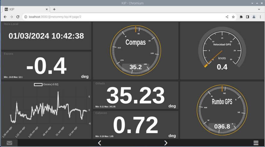 La App tablero de instrumentos Kip viene configurada en PiMares para poder mostrar en su mesa de cartas los datos generados por el IMU con solo pulsar su icono en el navegador de internet. Dispone de gráfico histórico de escora para los yates de regata que puedan verse beneficiados por esta información. El tablero de relojes Kip permite crear históricos para cualquier dato que exista en el servidor Signal K. |
